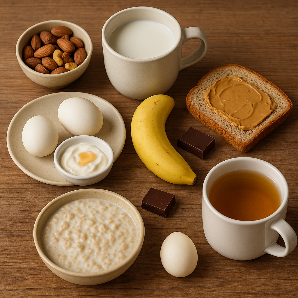 1️⃣ Light snacks with some protein Almonds, walnuts, or cashews (unsalted) Warm milk (cow’s milk, soy milk, or almond
